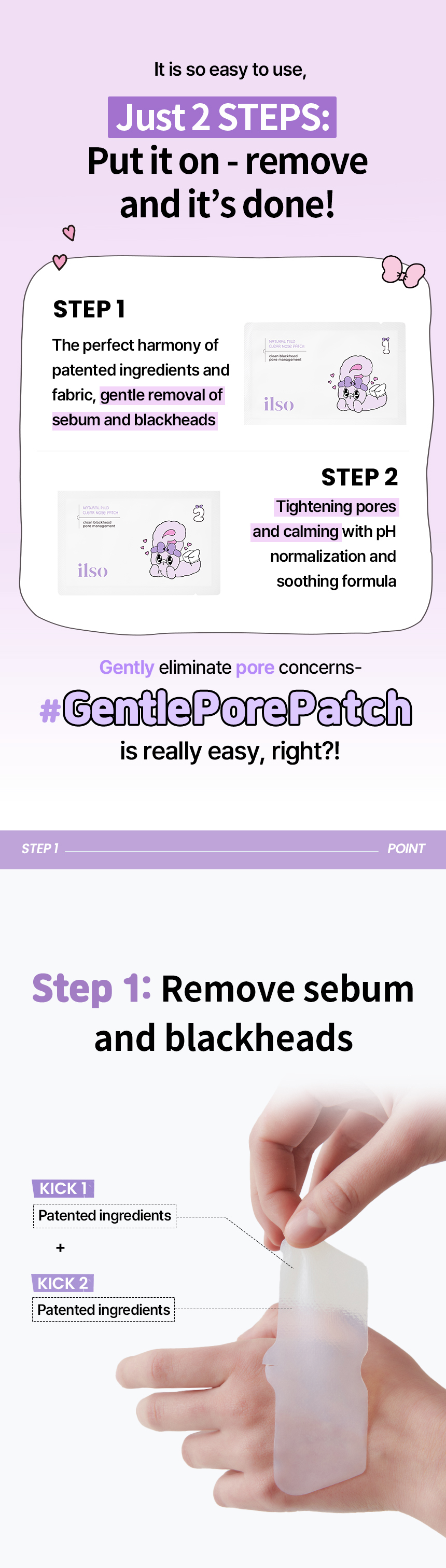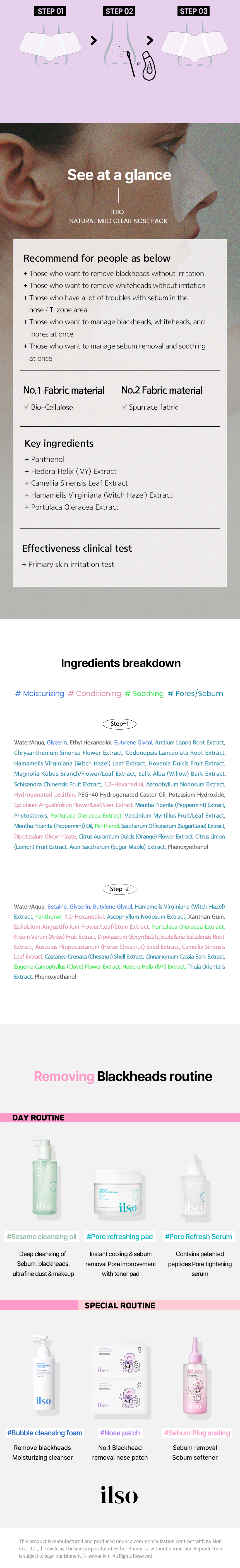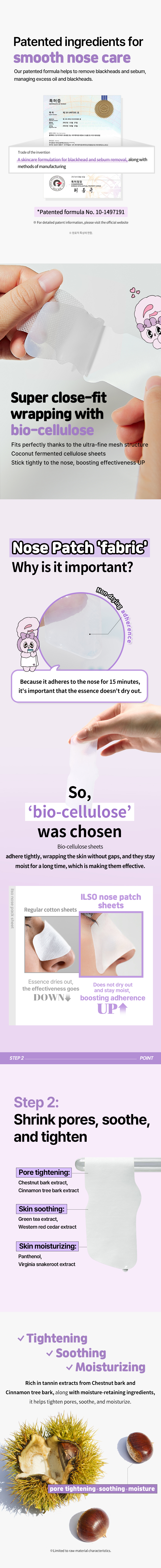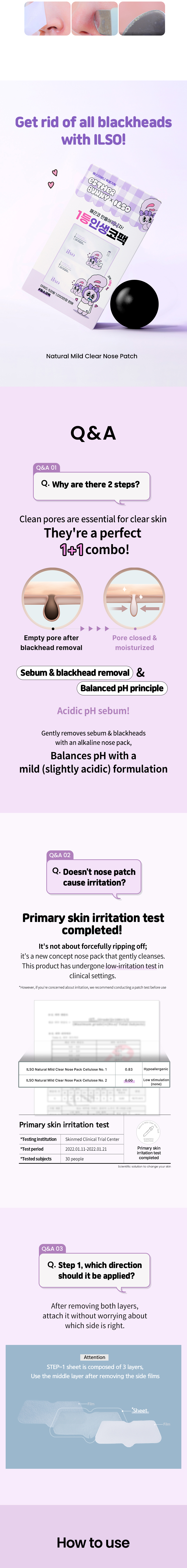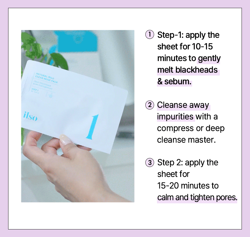1. Attach STEP-1 sheet for 10–15 minutes to soak wastes. 2. Use cotton swab or deep clean master to wipe out soaked wastes. 3. Attach STEP-2 sheet for 15–20 minutes to soothe and shrink pores.