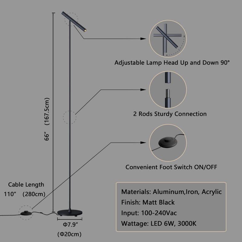 ilucezzo Floor Lamps for Living Room, 66" Modern Floor Lamp LED Standing lamp with Foot Switch 6W Warm Light Tall Lamp for Bedroom, Office, Study Room, Home, Lamp Head Adjustable