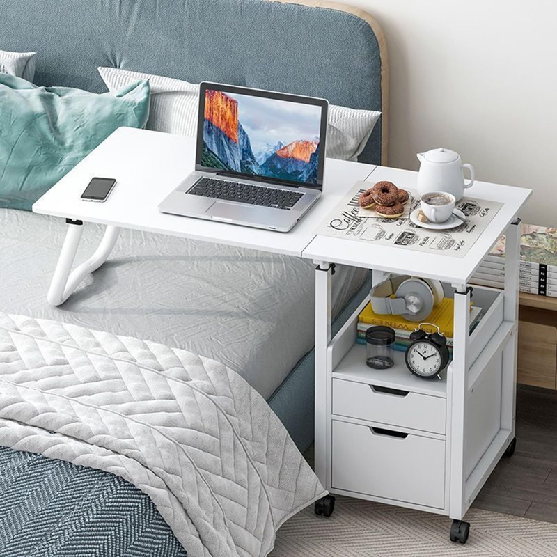 ILWorkTLs Height Adjustable Overbed Bedside Table with Wheels and Foldable Tabletop,Over Bed Laptop Desk with Drawer,White