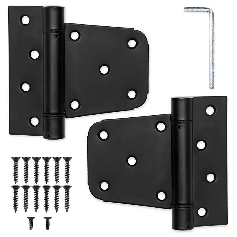 - SELF CLOSING T STRAP GATE HINGES are strong, made of heavy duty cold rolled steel, with a black powder coat.