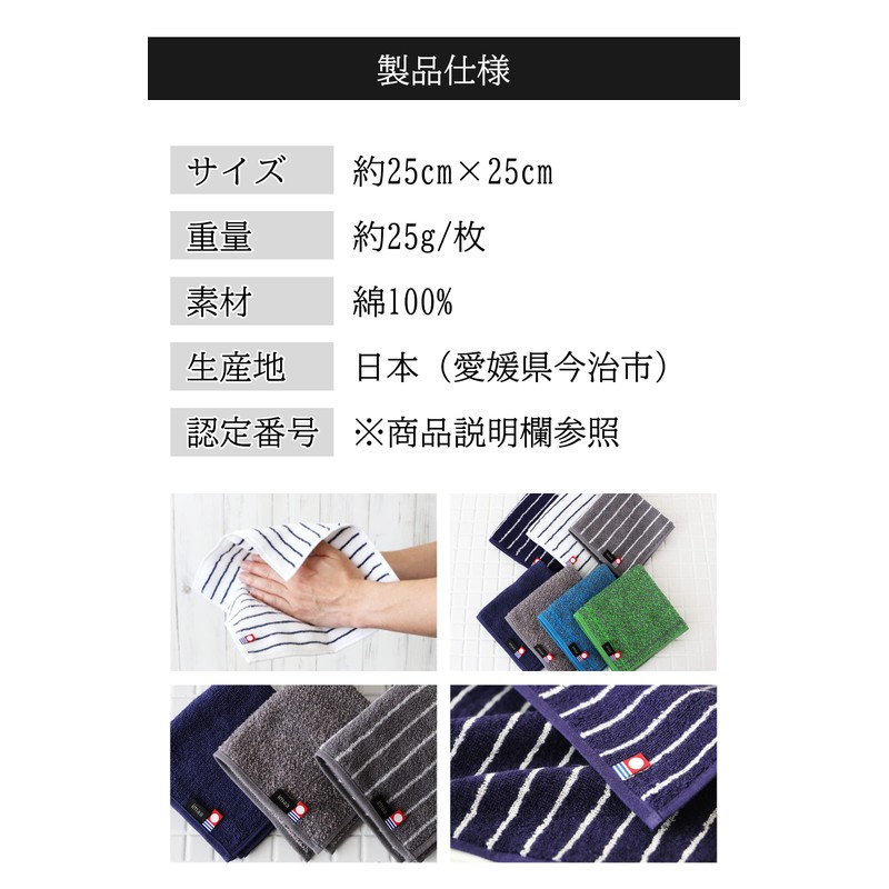 - Set includes: Imabari towel handkerchiefs x 2 // Size: Approx. 9.8 x 9.8 inches (25 x 25 cm) // Weight: Approx. 0.9 oz (25 g) // Design certification number: Navy: No.2018-890, White: No.2018-770, Mixed gray: No.2021-918, Pinstripe gray: No.2021-917, Reversible navy: No.2021-1129, Blue: No.2022-1325, Green: No.2022-1325, Mint: No. 2019-321, Striped blue: No. 2019-321 // Material: 100% cotton // Made in Japan (Imabari City, Ehime Prefecture) // *The colors in the product images may slightly vary from those of the actual product due to the color settings on your viewing device.