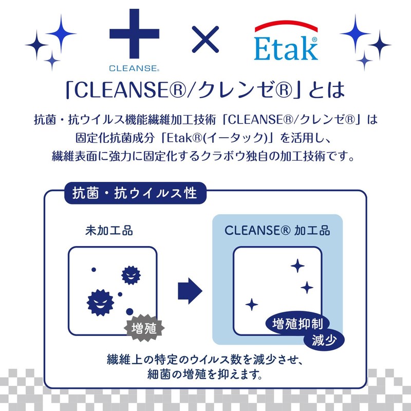 - (Excellent washing durability) In general, the effect will fade after repeated washing. However, the "CLEANSE/Cleanse" treatment maintains antibacterial and antiviral effects even after 50 household washes. You can use it for a long time