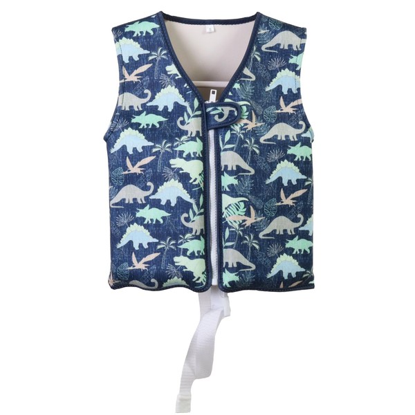 まるで洋服みたいなデザインの男の子向けフローティングベスト!大人気の恐竜プリント♪川遊びや磯遊びで活躍必至の必須アイテム★マリンレジャーの安全対策に!水辺のBBQなどでも「もしも」に備える!前ファスナー&マジックテープ仕様・脱げ防止股下ベルト付き・浮力材8個搭載※救命胴衣ではありません。のフローティングベストは。十分な浮力をもたせたものですが。国土交通省の検定品ではありませんので。救命胴衣としての使用はできません。身長目安/浮力/体重目安⇒S:100-120cm/約3.5kg/約35kg以下、M:120-140cm/約4.75kg/約47kg以下