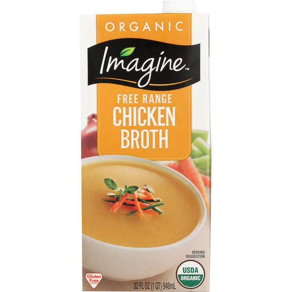 - Imagine Organic Free Range Chicken Broth. Imagine natural creations.Low fat & no added msg.USDA organic.*See nutrition information for sodium content.Gluten free.32 fl oz (1 qt) 946ml.