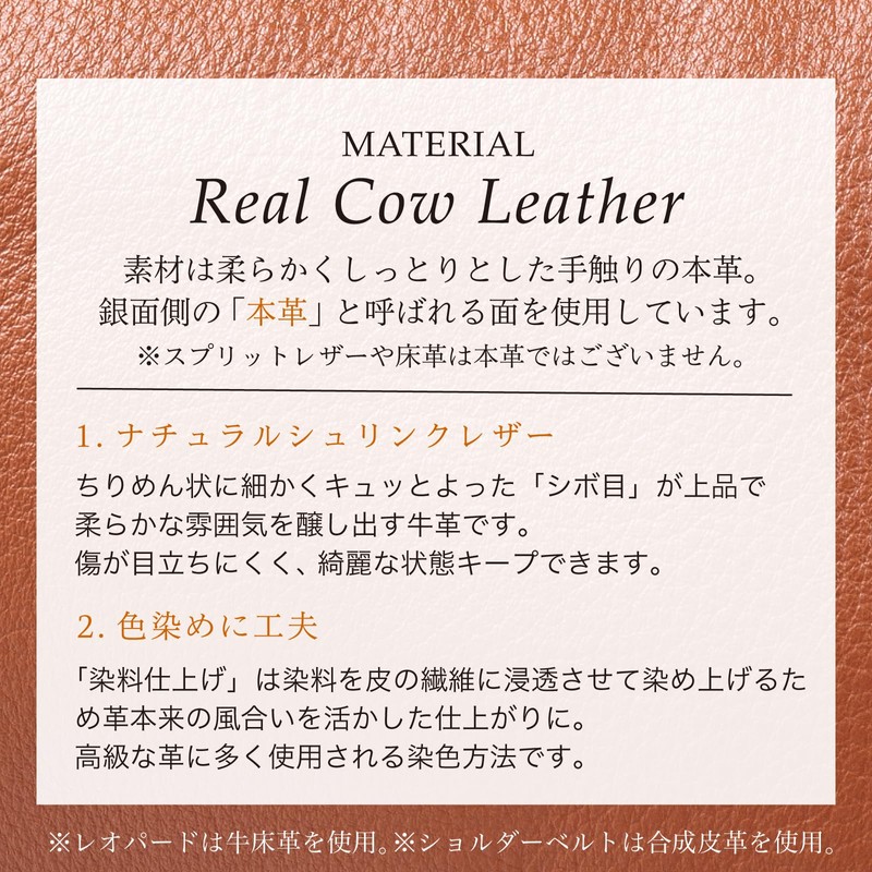 Outer Material: Cowhide leather (body), Nylon (gusset, bottom), Synthetic leather (shoulder belt); Only the leopard pattern is cowhide leather.