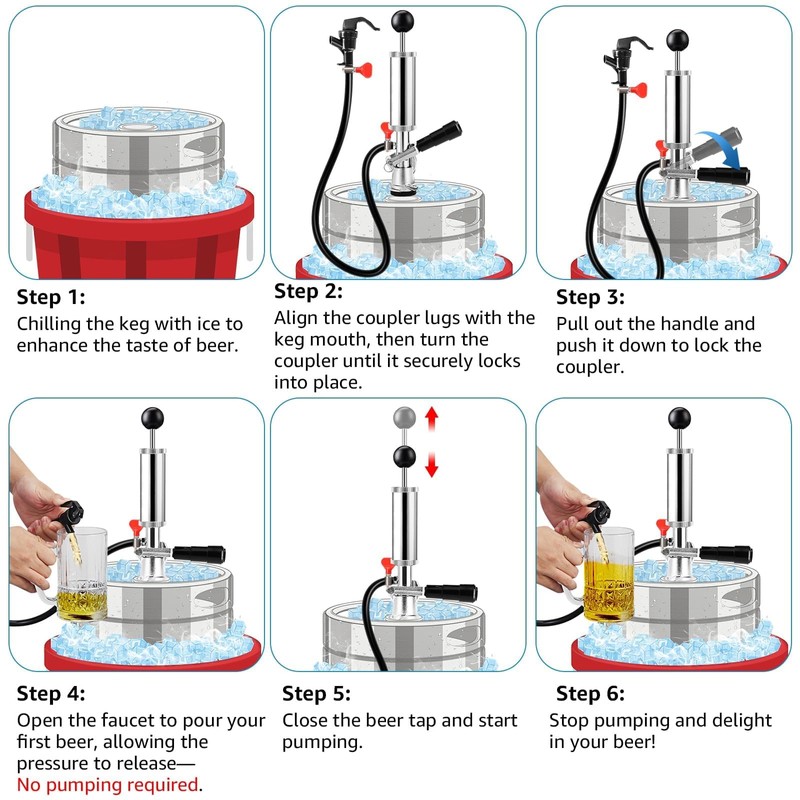 - 【Easy to Operate】The beer tap for keg just needs to align the lug of the coupler with the mouth of the beer keg, then turn the coupler and fix it, finally hold the handle and push down to lock the connector, simple structure, easy to assemble, easy to use, no gas bottle, no regulator, just put the beer keg into a bucket of ice, Then open the beer tap and pump out the beer to enjoy a delicious beer with little foam!