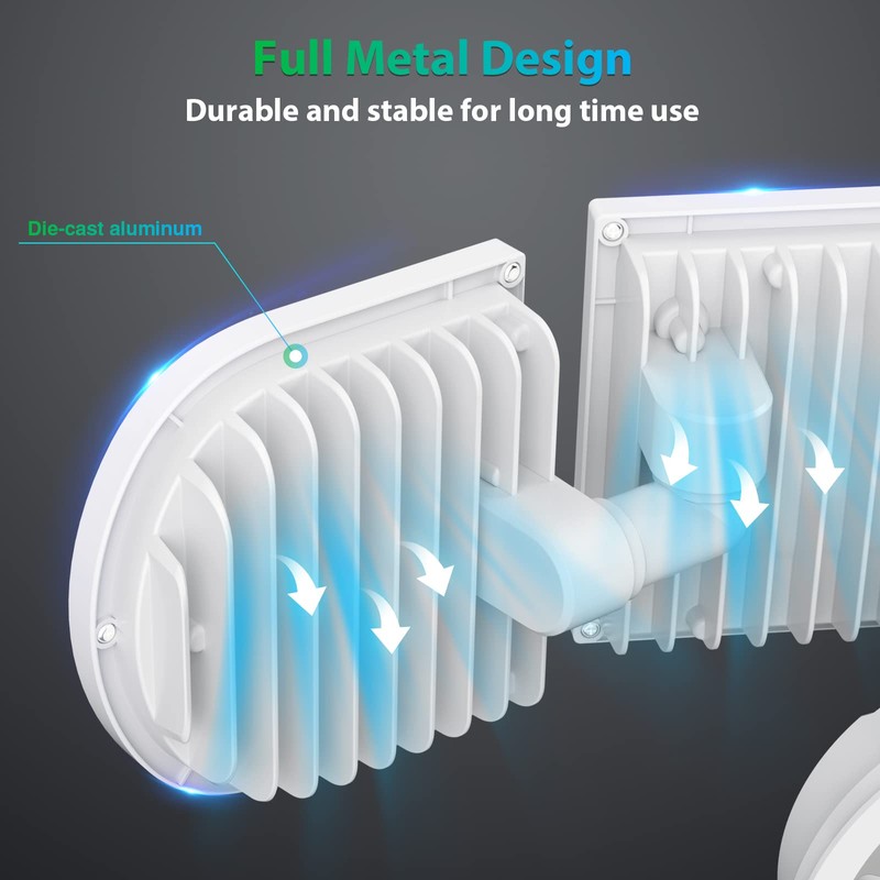 - 【Full Metal Design & Efficient Cooling】Made of resilient die-cast aluminum and designed to be fin-shaped, the outdoor flood light dissipate heat more efficiently and greatly extends its lifespan, maintaining good performance for a long time.