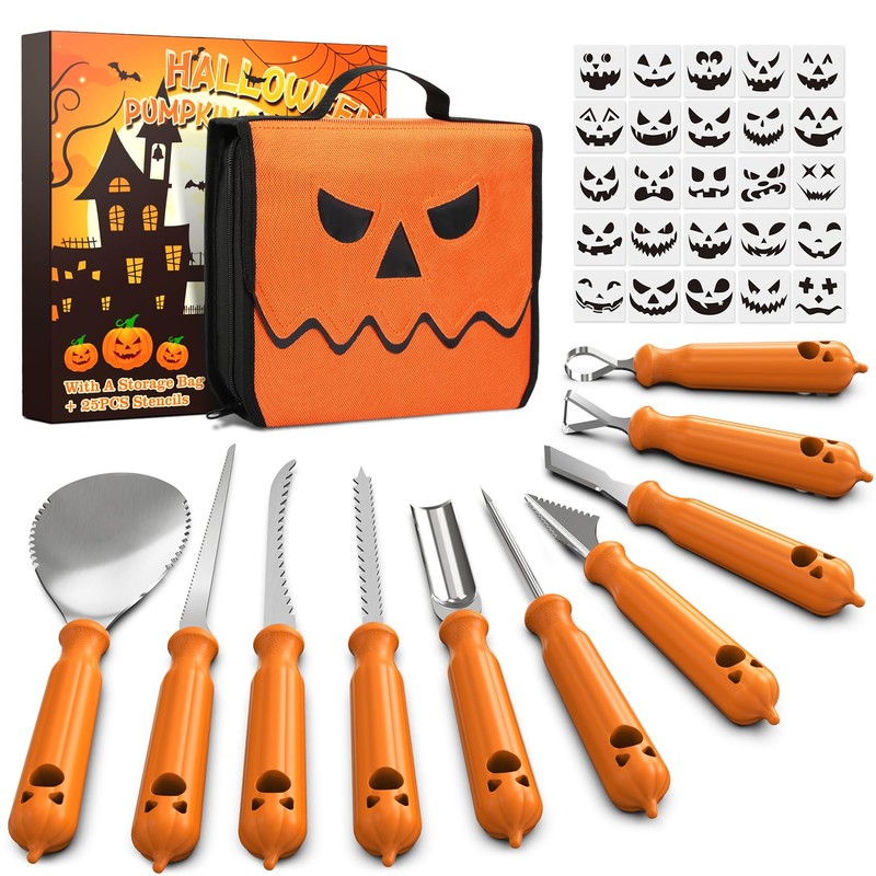 - 10 PCS Pumpkin Carving Kit: Our professional Halloween pumpkin carving set contains 10 PCS Carving Tools, 25 PCS Pumpkin Stencils, 1 PC Portable Storage Bag. The storage bag can also be used to hold any tools you want, such as wood carving knives, etc. You will create a unique Halloween artwork with this practical pumpkin carving tool set
