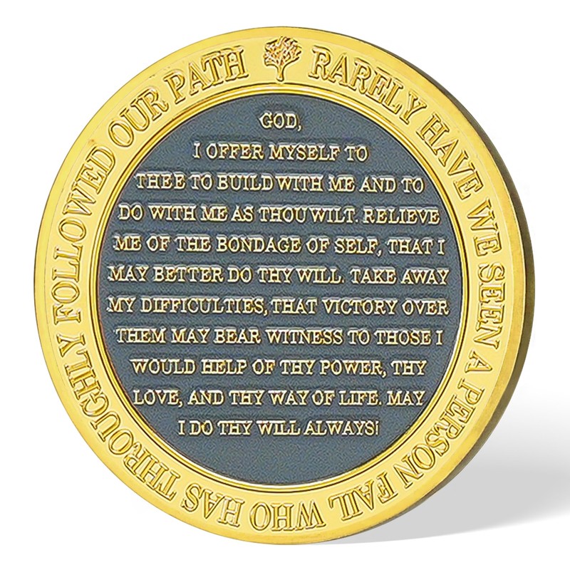 - INSPIRATIONAL TEXT: The back of the Sobriety chip features the sobriety prayer “God, I offer myself to you to build with me and to do with me as thou wilt. Relieve me of the bondage of self so that I may better do thy will”. Relieve me of the bondage of self so that I may better do thy will. Take away my difficulties so that victory over them may bear witness to those I would help of thy power, thy love, and thy way of life. May I do your will always” can deeply touch the heart of the ex-alcoholic and give them spiritual support.