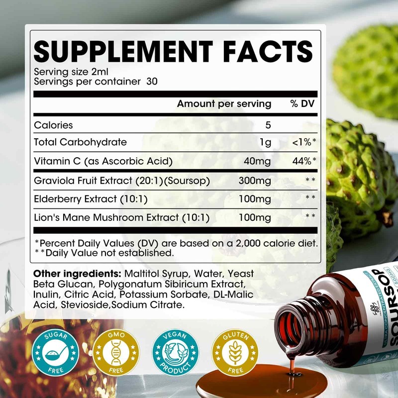 iMATCHME Soursop Bitters Liquid Drops, a scientifically crafted blend designed to empower your daily wellness. Our 3-in-1 formula combines 300mg Soursop Graviola extract (20:1 concentrated), Elderberry, Lion's Mane Mushroom, rich in Antioxidant and Vitamin C, delivering 98% rapid absorption to target your body's core needs:+ Immune Support300mg Graviola extract + Elderberry provides antioxidants to support your body's natural defenses.*+ Gut HarmonyLion's Mane Mushroom promotes digestive comfort and nutrient absorption*, while Graviola's help no bloating.*+ Cell VitalityAntioxidant-rich soursop fights free radicals*, while Vitamin C for healthy skin and cell regener.*+ Up EnergyLiquid bioavailability delivers nutrients faster than pills*, converting soursop's compounds into lasting energy for workouts, workdays, and mom life.*Why Choose Us??? 3X Synergy Formula: Graviola + Elderberry + Lion's Mane Mushroom work together for amplified benefits.?? 98% Absorption: Lab-tested liquid efficiency vs. slow-acting capsules.?? Clean & Natural; Pure: Sugar-free, Non-GMO, Vegan. No artificial flavors or harsh additives.Usage:Add 2 drops (2ml) to water, juice, or smoothies daily. 60ml = 30 servings.