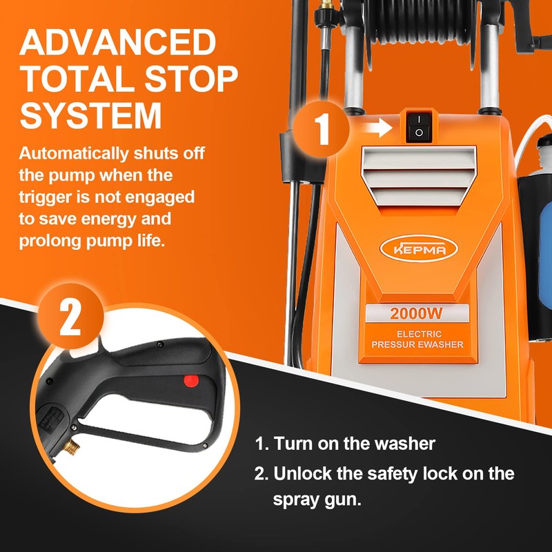 - TSS(TOTAL STOP SYSTEM): Automatically shuts off the pump when the trigger is not engaged to save energy and prolong pump life. High-pressure hose with the explosion-proof inner layer.