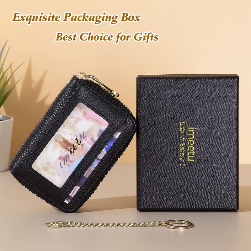 imeetu RFID Credit Card Holder, Small Leather Zipper Card Case Wallet with Removable Keychain ID Window (Black)