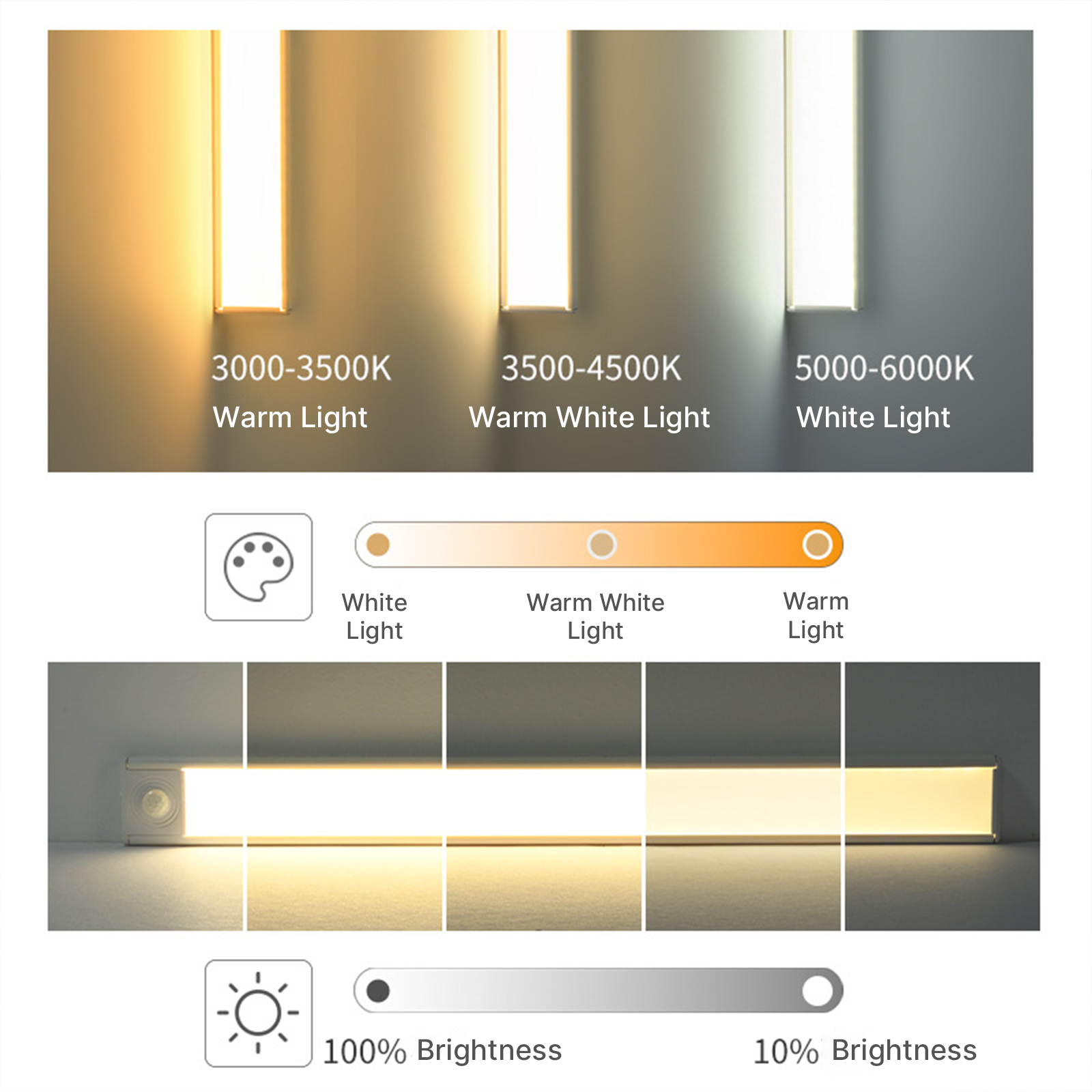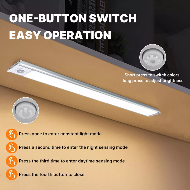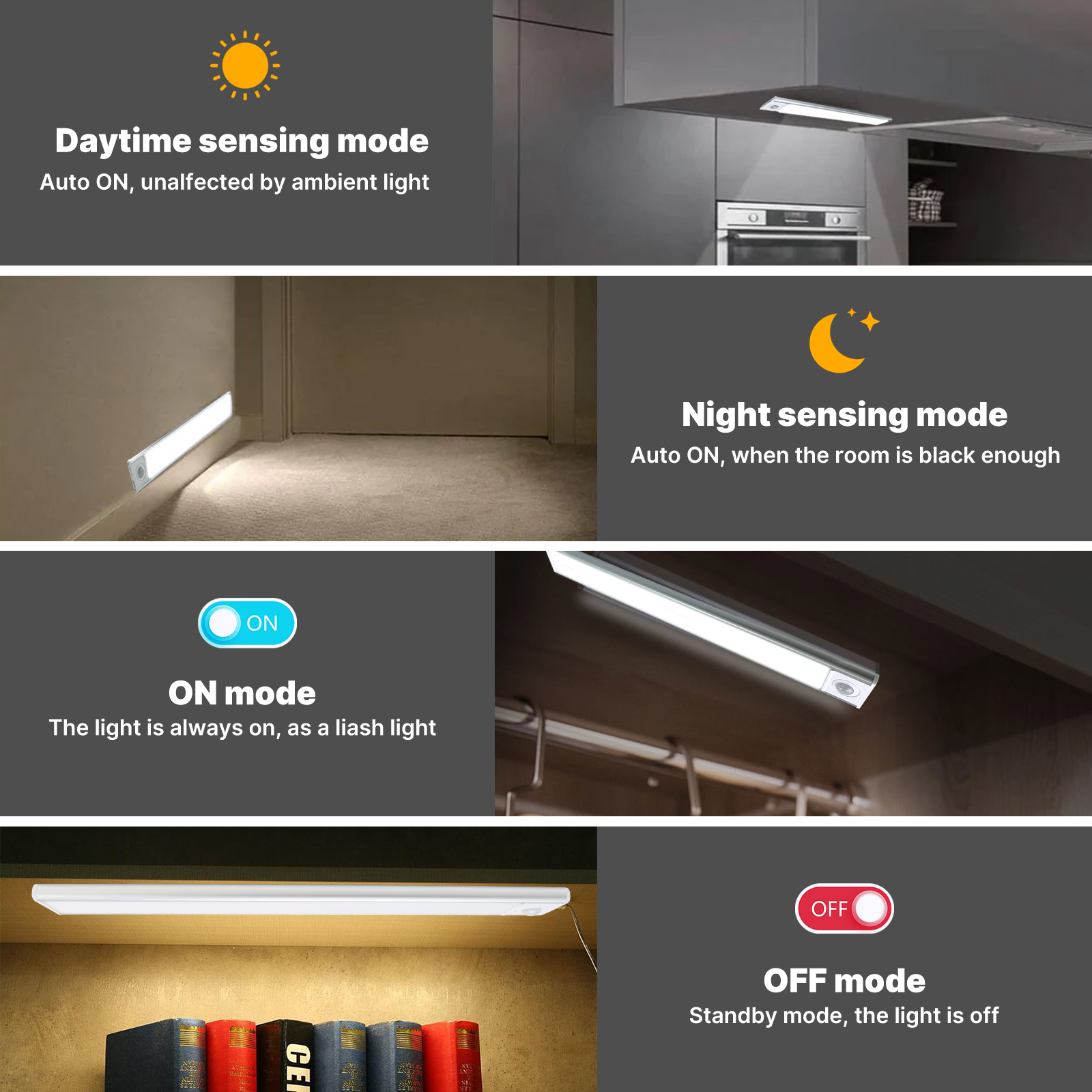 - This cabinet sensor light has 3 lighting modes: 1. Constant light mode; 2. Night sensing mode (insufficient light and sensing people); 3. All-day sensing mode