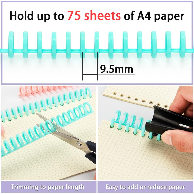 - 【Variety of Binding Spines】 Including 2 pink, 2 mint green, 2 white, and 4 translucent binding spirals. You'll receive a total of 10 pcs, suitable for notebooks up to A4 size in length(If used for paper smaller than A4, you can cut it into any length you wish). Our trimmable binding coils have a hole diameter of 1/2 inches (13 mm) and can hold up to 75 sheets. Included is a bonus black opening zipper for opiening the binding coils during refilling or paper changes.