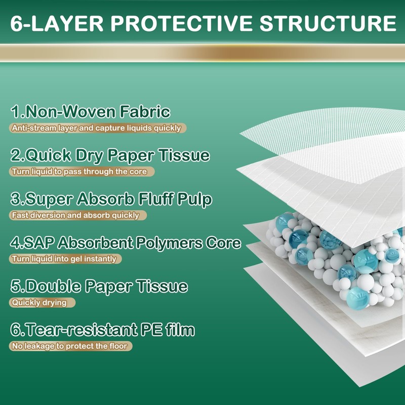6-layer ProtectionThe 6-layer protection technology makes it super absorbent and leak-proof to protect your floors or carpets by preventing leaks. And the absorbent polymer layer instantly turns liquid into a gel, preventing tracking, liquid overflow, and bad smell.