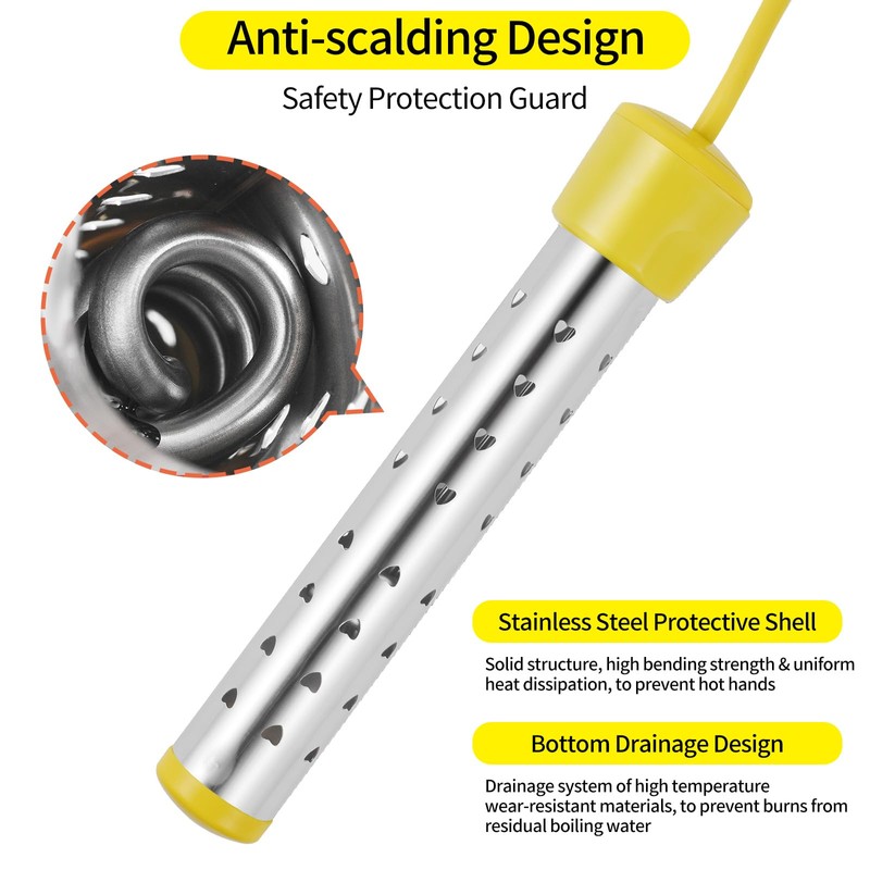 - Easy to use: 1500W electric submersible water heater in water at an appropriate level and plug it into any grounded 120V AC socket; In working condition, the heater needs to be completely immersed in water