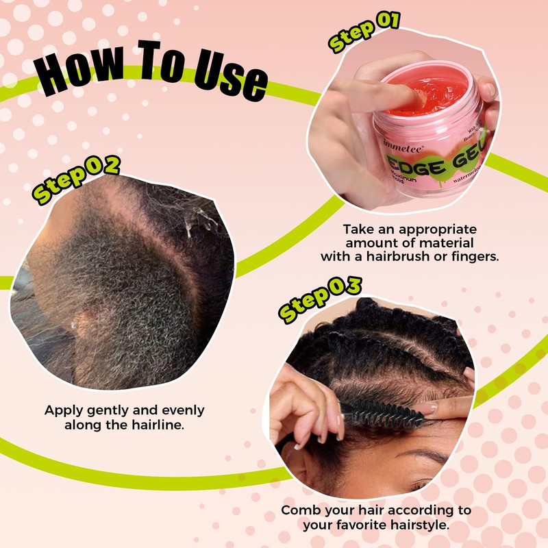 immetee Edge Gel, Frizz Control Strong Hold Hair Styling Gel with Edge Control Brush, Add Shine Flyaway Hair Tamer, Watermelon Flavor 100g.