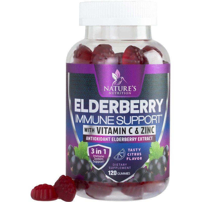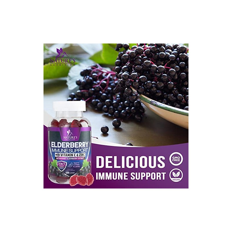 Immune Support Gummies with Sambucus Black Elderberry Extract, Zinc & Vitamin C Gummy, Nature's Natural Vegan Immune Support Supplement for Adults & Children, Delicious Elderberry Gummy - 120 Gummies
