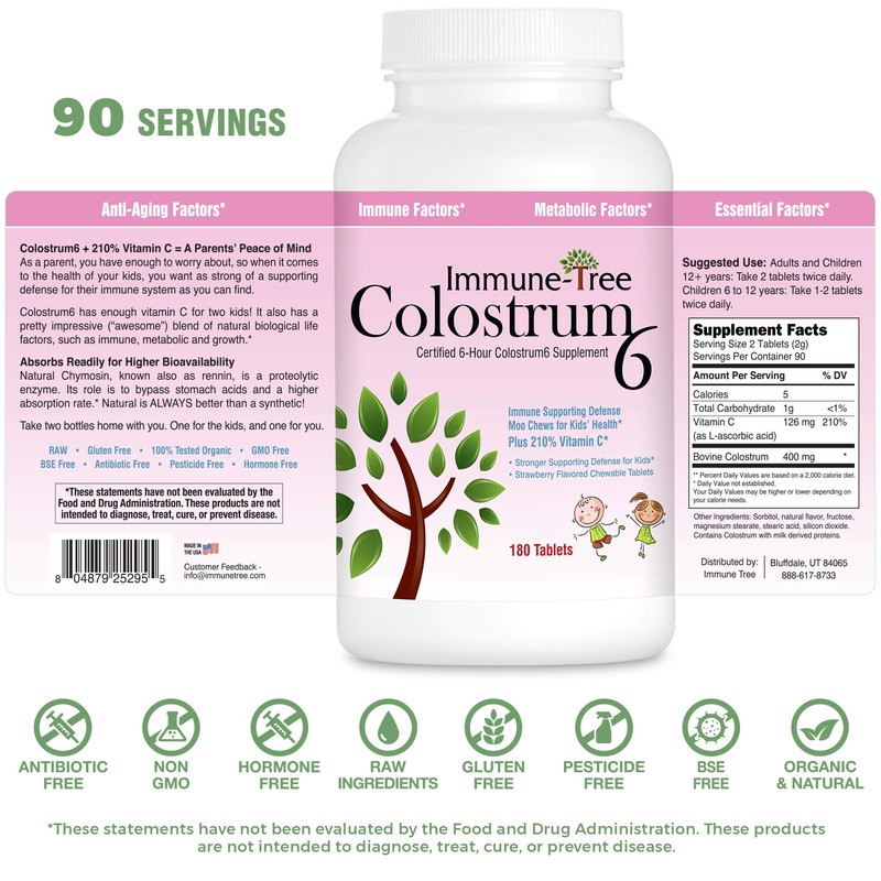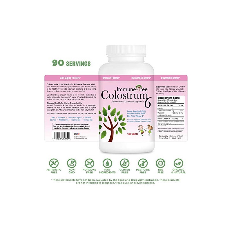 - 180 TABLETS - Each chewable lozenge contains 900mg of HIGH QUALITY ALL-NATURAL CERTIFIED 6-HOUR COLOSTRUM to be slowly absorbed in your mouth - Made from grass fed, Grade A, Dairy cows that are certified healthy, BST, BSE and Antibiotic-Free