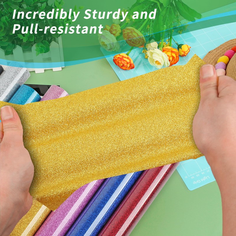 - 💝「Must-have for Home Decor and Parties」- Our htv vinyl comes with premium PET backing, it won't stick to cutting mat like paper backing, saving your consumption to the greatest extent. Glitter Gold vinyl can DIY the pillows on the sofa, home clothes, cotton slippers, etc which is very suitable for parent-child interaction. When holding a party, you can make many decals and unique clothes. At Christmas, you can design your child's favorite pattern for the socks to put gifts on.