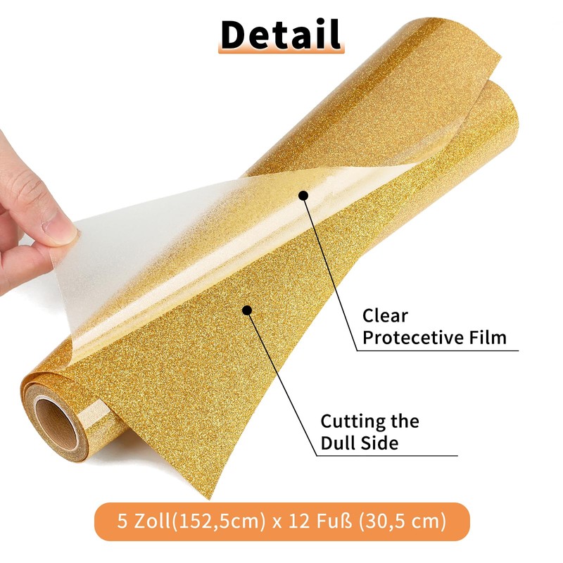 - 💛「Advanced Customization」- 12’’ x 5 Ft (30.5 x 153 cm) Glitter Gold heat transfer vinyl with controllable size. It's perfectly suitable for a 12x12'' or 12x24'' mat. Glitter Gold iron on vinyl is compatible with all cutting machines like Cricut maker, Explore Air 1 and 2, and silhouette Cameo, so you don't have to worry about buying the wrong Glitter Gold vinyl! Note: It's not permanent vinyl! Our htv vinyl needs to be hot-teared, no need to wait for cooling before tearing!