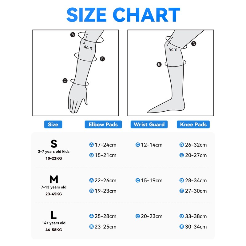 - ✔ 3 sizes meet most needs – S: for children aged 3-6 years (10-22 kg), M: for children and teenagers (23-45 kg), L: for teenagers and adults (46-58 kg). The adjustable straps and Velcro straps of the protector set allow easy adjustment of the size.