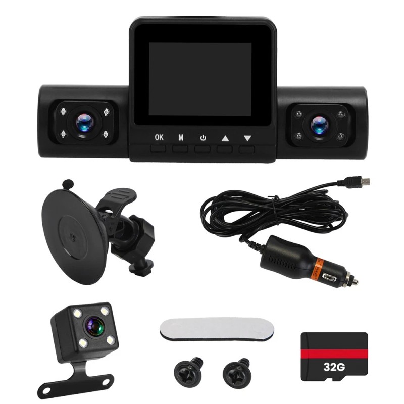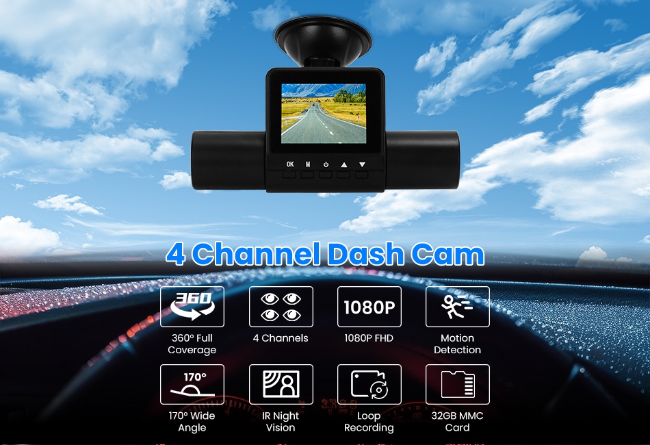 Free Shipping Featured Item Product Detail Image GalleryProduct DescriptionOverview: Our 4-channel car dash cam is a guardian on the roads, ensuring that you have everything documented whenever needed. 360° All-around surveillance ensures you don’t miss any detail on the road, effectively covering blind spots and mitigating potential liability issues. Intelligent motion detection technology saves on storage space by reducing unnecessary footage, and IR night vision captures clear black-and-white video recordings during the night or in low-light conditions. When the included 32GB MMC card reaches capacity, the loop recording function automatically replaces the oldest recordings with the latest ones. Its sleek design is crafted for compatibility with most vehicles, promising not to obstruct your line of sight while driving. Features: