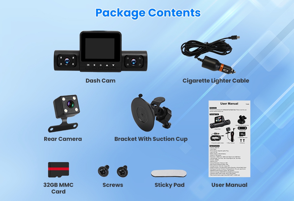 Free Shipping Featured Item ![]() ![]() Product Detail Image Gallery![]() ![]() ![]() ![]() ![]() Product DescriptionOverview: Our 4-channel car dash cam is a guardian on the roads, ensuring that you have everything documented whenever needed. 360° All-around surveillance ensures you don’t miss any detail on the road, effectively covering blind spots and mitigating potential liability issues. Intelligent motion detection technology saves on storage space by reducing unnecessary footage, and IR night vision captures clear black-and-white video recordings during the night or in low-light conditions. When the included 32GB MMC card reaches capacity, the loop recording function automatically replaces the oldest recordings with the latest ones. Its sleek design is crafted for compatibility with most vehicles, promising not to obstruct your line of sight while driving. Features: