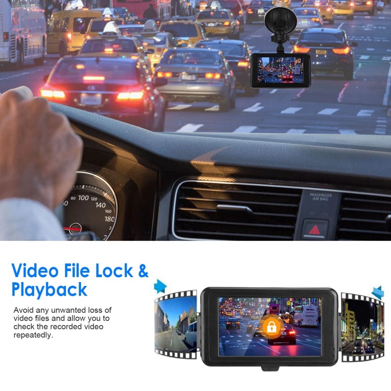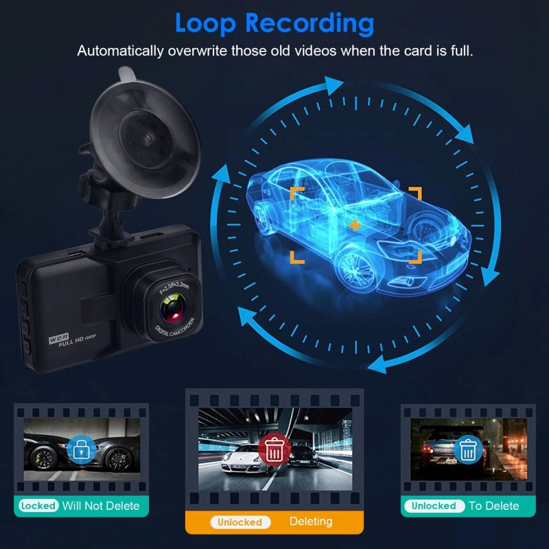 3in Car DVR Camera Dash Cam Camcorder Featured Item Product Detail Image GalleryProduct DescriptionOverview: Our 3in front dashboard camera is a reliable driving assistant which can help you avoid unnecessary insurance claims and disputes by recording the traffic conditions clearly with its up to 1080P resolution and 100° wide angle lens. It can support 32G MMC card to have a seamless loop record and when the MMC card is full, it will automatically delete the oldest videos to make room to the newest one. Additionally, it also supports video file locking and video playback function to avoid any unwanted loss of important video files and allow you to check the recorded video repeatedly. Features: