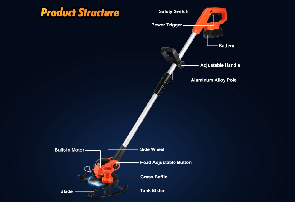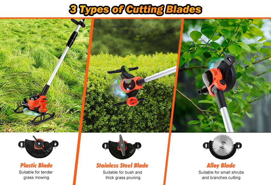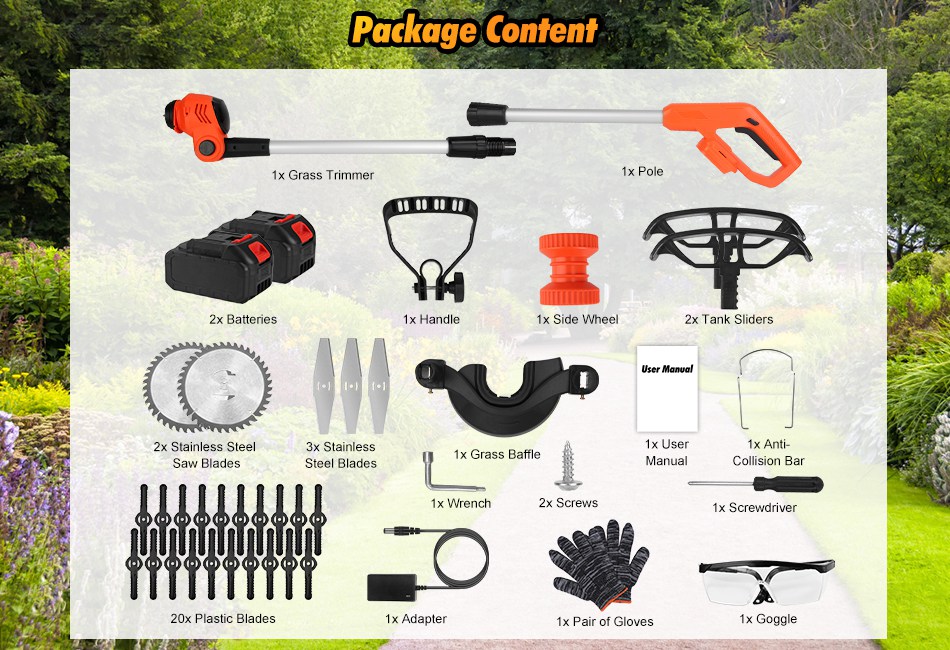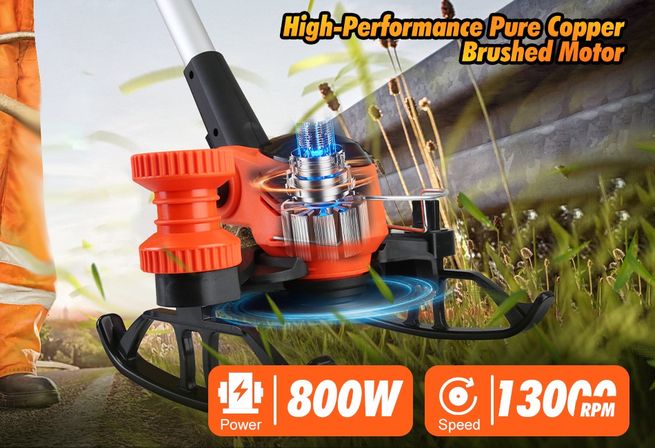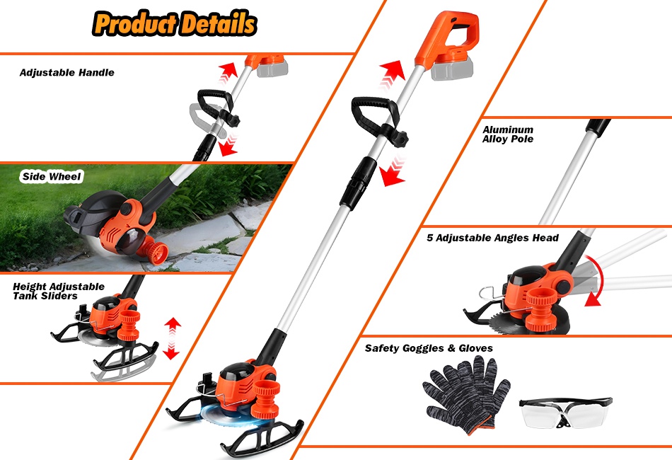 This high-performance grass trimmer is equipped with 800W pure copper brushes motor, delivering 15000RPM rotating speed to effortlessly trim yards, shrubs, flower beds, roadside areas, and even parks. The height adjustable tank slider wheels provide ergonomic support to prevent back and knee soreness during long work sessions. 3 Different types of blades can perfectly suit various gardening tasks. Safety switch and overheat protection ensure safety during sue. A versatile and user-friendly tool suitable for all horticulturists and gardening enthusiasts. Features: