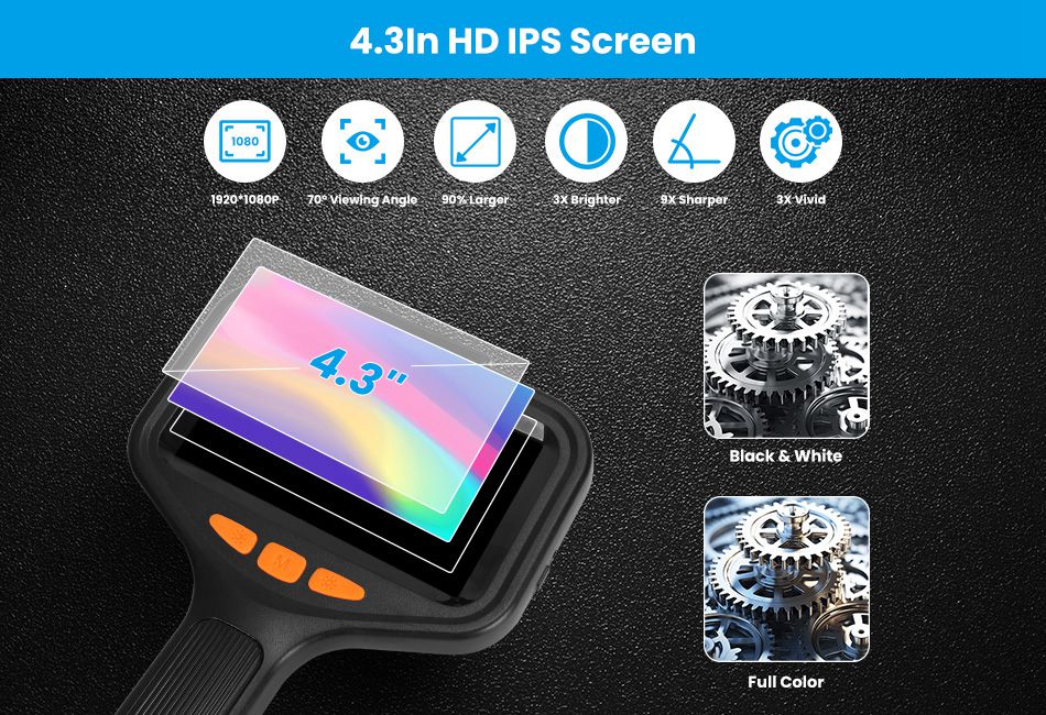 • 4.3In HD IPS Screen:Adopting advanced smart chip,our articulating borescope inspection camera boasts with true color 4.3in IPS screen with 1920*1080P high resolution. Not only provides a horizontal viewing angle of about 70ºfor your inspections,but also offer 2 modes(Black & White/Full Color) that suits your needs. Require no phones,no APP,no WiFi and no wireless mode setup,convenient to use.