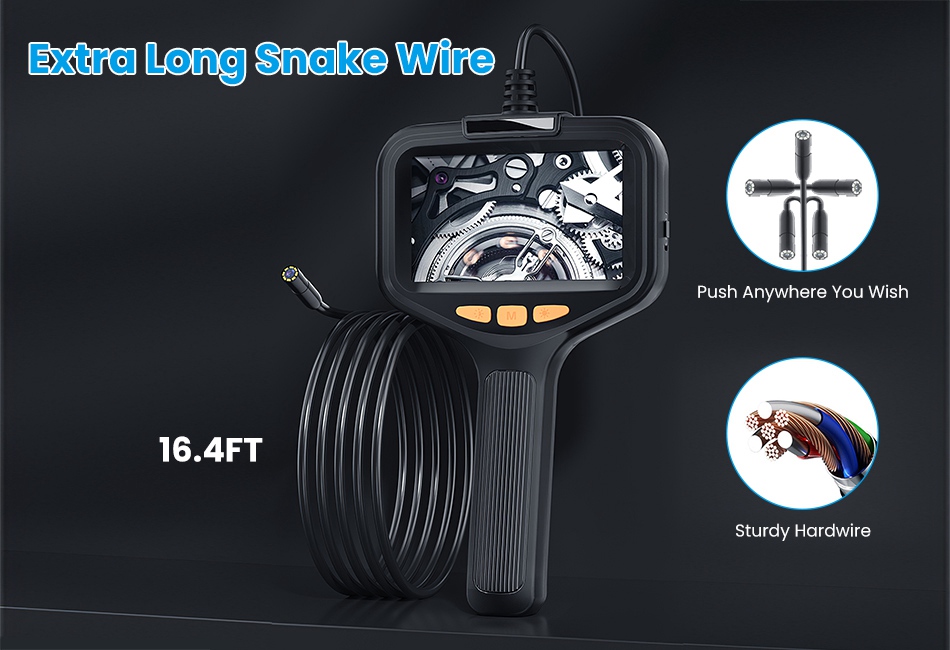 • 16.4 FT Bendable Hardwire:Constructed out of metal hardwire,our snake camera provides a 5m/16.4ft length that allows easy passage through hard-to-reach areas for a better inspection experience. More suprisingly,you can bend flexibly at any angle and and hold its shape to access a wide variety of narrow places.