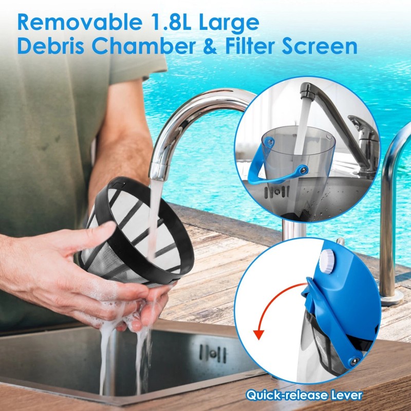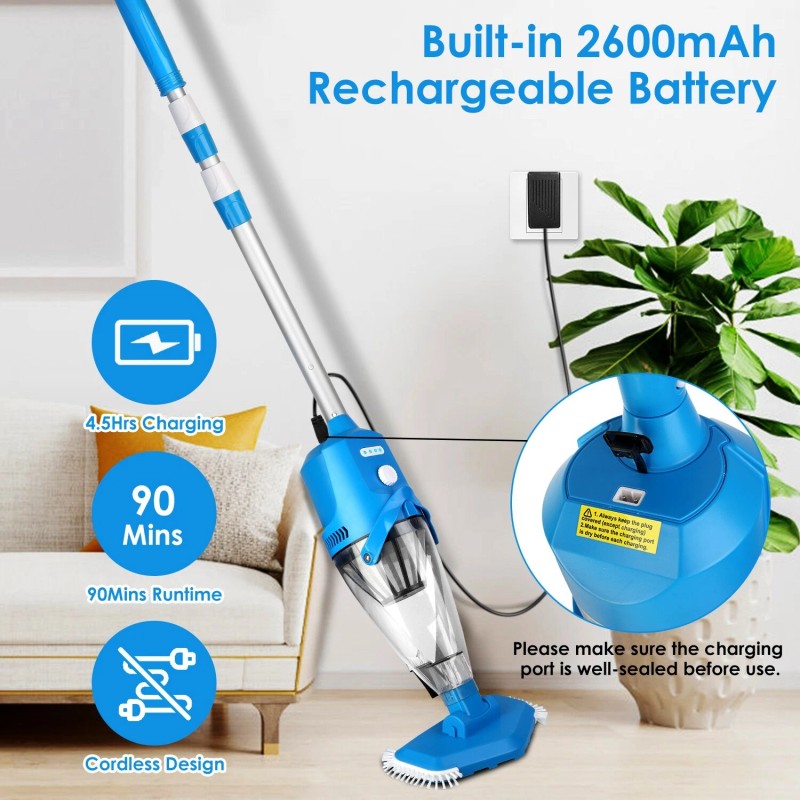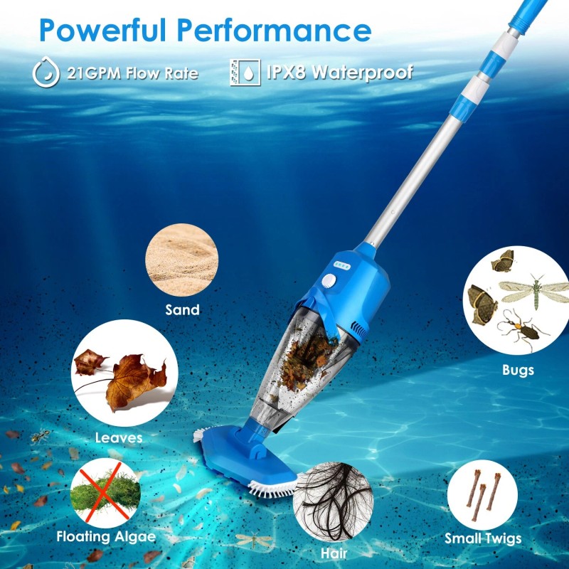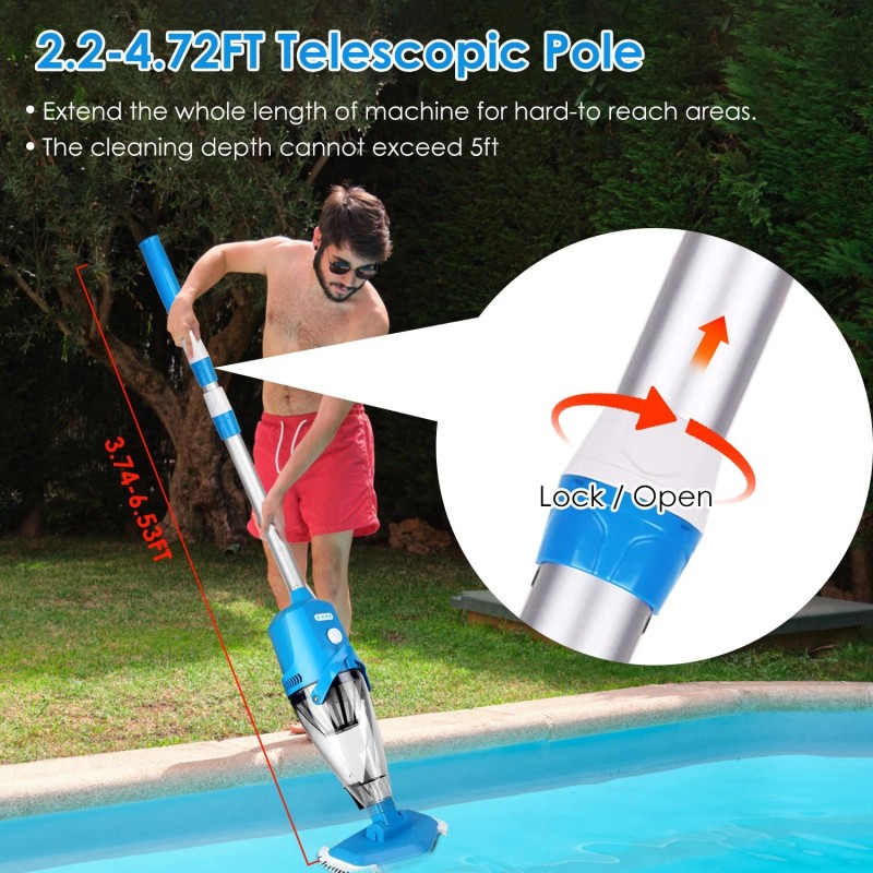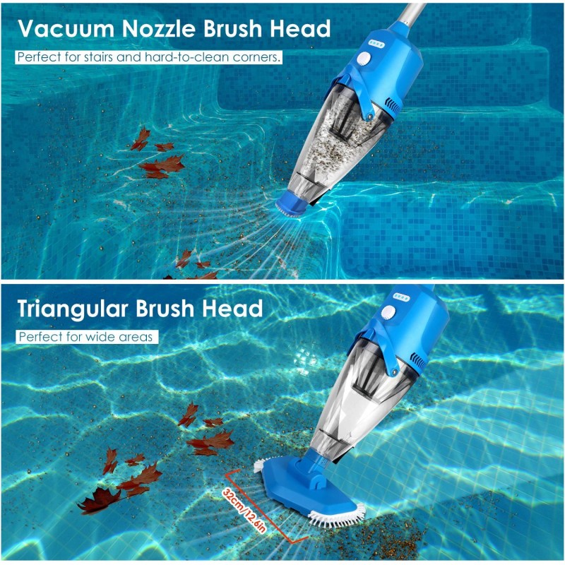 Are you troubled by the sand, leaves, mud and other dirt at the bottom of the pool? Built in a powerful brushed motor, our cordless pool vacuum with telescopic handle delivers a flow rate of up to 21gallons/min, perfectly designed for quick and efficient debris pick-up: acorns, twigs, leaves, dirt, and sand. Embedded in 2600mAh rechargeable battery for 90minutes of uninterrupted cleaning. Cordless and no pool vacuum hose is needed to operate the cleaner. Come with short handle, 26.38-56.69in telescopic pole, triangular brush head and nozzle brush head. Feature 1.8L large debris chamber and excellent IPX8 waterproof performance, ideal for easy spot cleaning of in-ground pools, above-ground pools, inflatable pools, salt water, chlorine pools, SPA, and hot tubs. Features: