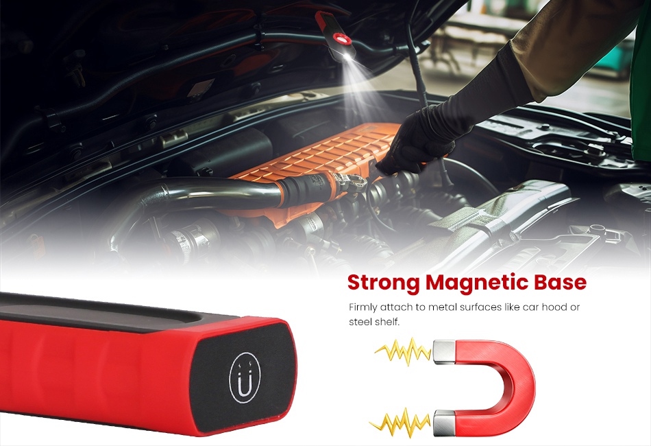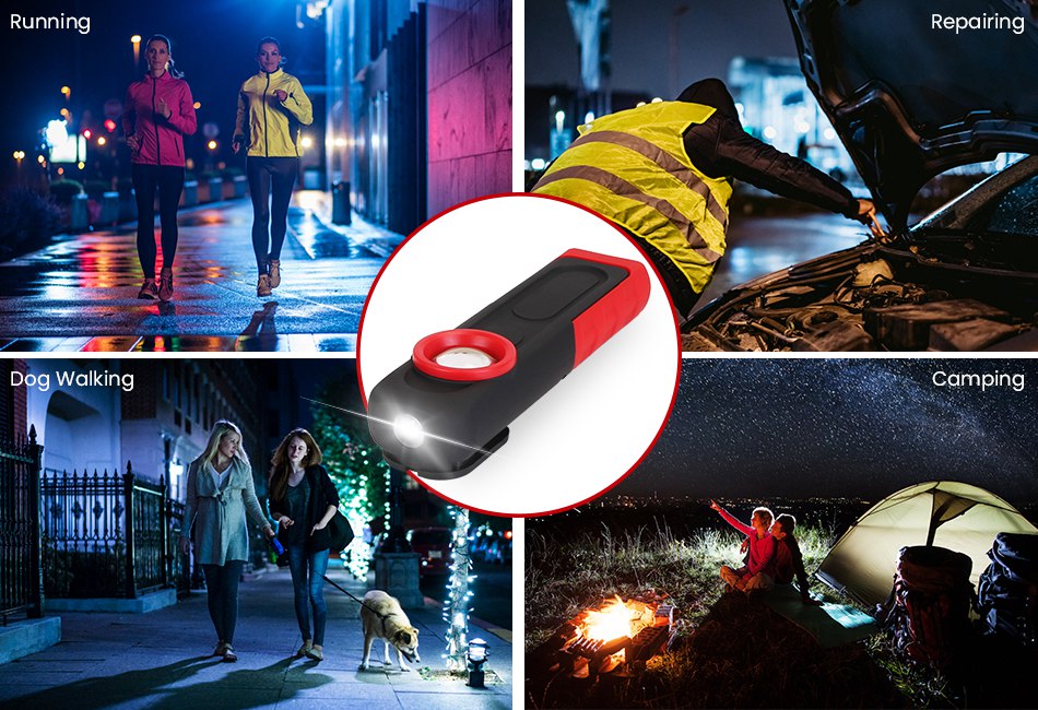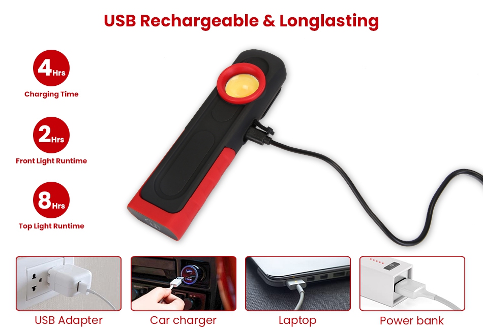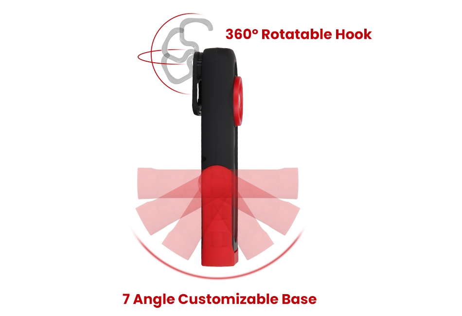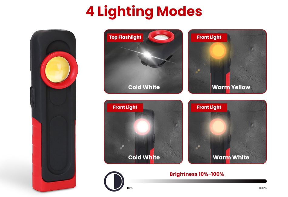 Do you often do repairing work? Then our portable LED work light is definitely for you! Our pocket light is endowed with 4 modes that cater to a variety of scenarios, such as hiking, camping, hunting, climbing, night walking, backpacking, caving, auto repairing in particular! The specially designed stepless brightness adjustment is a suprising bonus when using. The 360º rotatable hook allows you to attach it to belts, tool bags, or tent tops and the magnet base can firmly attach to various metal surfaces like car hood or steel shelf while repairing. What’s more, both the Hook and base are designed to be foldable and enable the flashlight to be so slim that perfectly fits your pocket for convenience. USB rechargeable and IP44 waterproof. A helpful assistant and thoughtful gift for repairers and adventurers! Features: