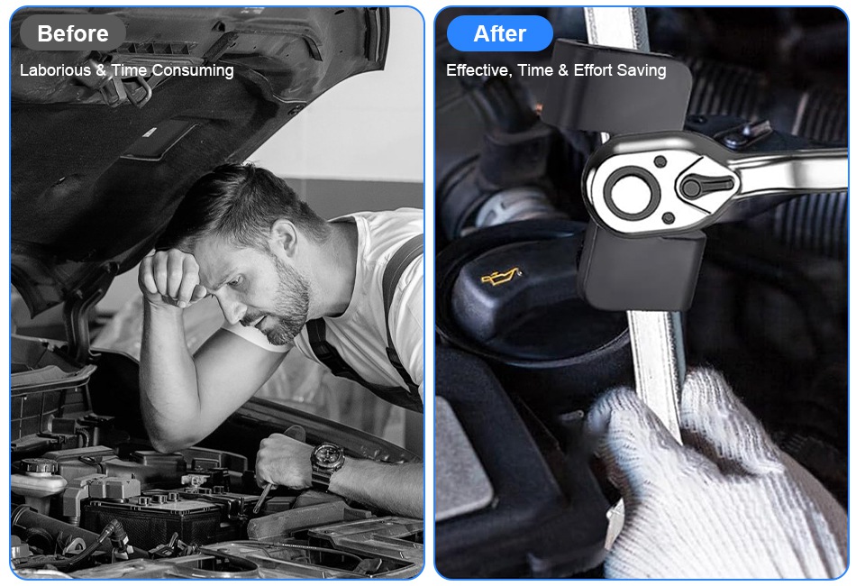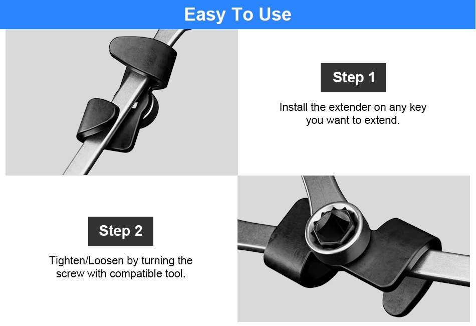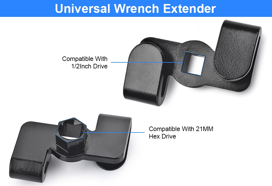 Compatible with both 1/2 inch drive and 21 mm hex drive, our universal wrench extender is designed to help you handle those stubborn rusty nuts and bolts in hard-to-reach areas. Simply flip over to change the function of this wrench extension tool, you can use it to either tighten or loosen those overtightened nuts. Made of sturdy carbon steel with protective coating, this corrosion-resistant, heat-resistant, rustproof wrench extender ensures great durability and high strength. Suitable for dealing with heavy duty machines, cars, household appliances, or a variety of applications. Features: