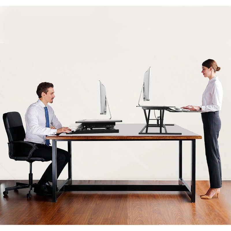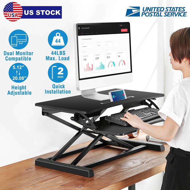 Height Adjustable Laptop Desk Dual Monitor Table Stand Keyboard Tray Removable Featured Item Product Detail Image GalleryProduct DescriptionOverview: Sit on top of your existing desk and allow you to work comfortably from either a sitting or standing position. It features smooth and quiet height adjustments without shake or rattle, ensuring a stable surface for all your devices. Featured with 44LBS max load, 5.12in-20.08in quick height adjustment, large working area can place one monitor, one notebook PC within 32inches, and some files. Come with a phone/tablet slot on keyboard tray, entertain yourself and offer you a healthier work style. Eliminating or reducing neck, back and shoulder pain. Features: