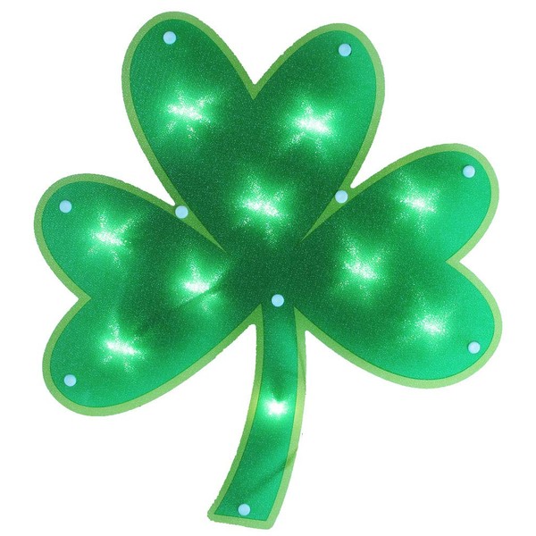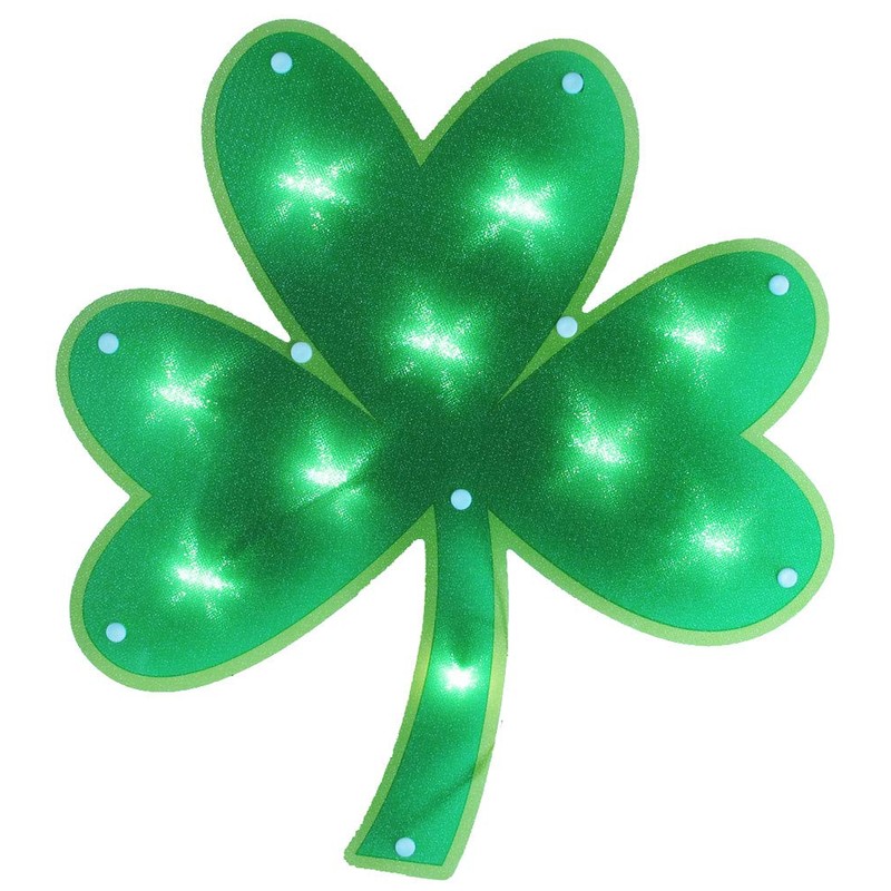 Luck o' the Irish Shamrock lighted window decoration will dress your home in holiday style. Green shamrock lighted sign is festive, fun. Add just the right touch to your St. Patty Day decorations with this four leaf clover window decoration. UL approved, require no batteries or assembly and come with a handy suction cup for ease of hanging.