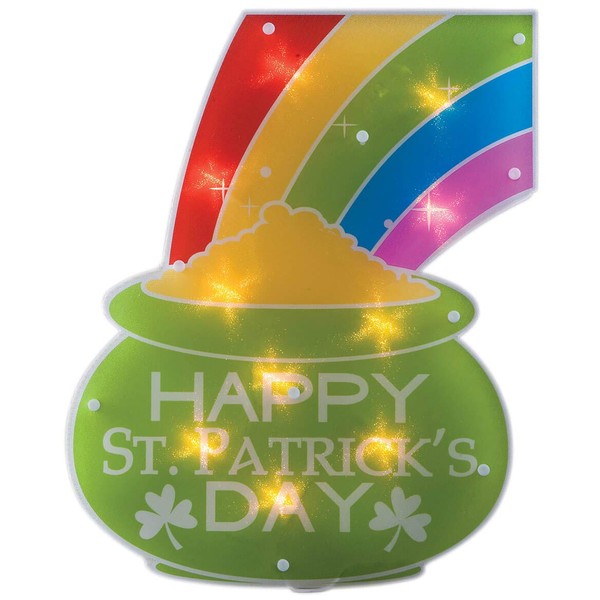 - THEME: Lighted Pot of Gold window decoration has a gorgeous effect in the window. Features glittery green pot of gold with a rainbow. This lighted St. Patrick’s Day Shamrock decor is holographic and makes the window look magical. Bright and beautiful Shamrock Lighted Window Decoration or Shamrock Lighted Wall Decoration. Use outside or inside your home, retail shop, school, daycare, store, assisted living facility or nursing home.