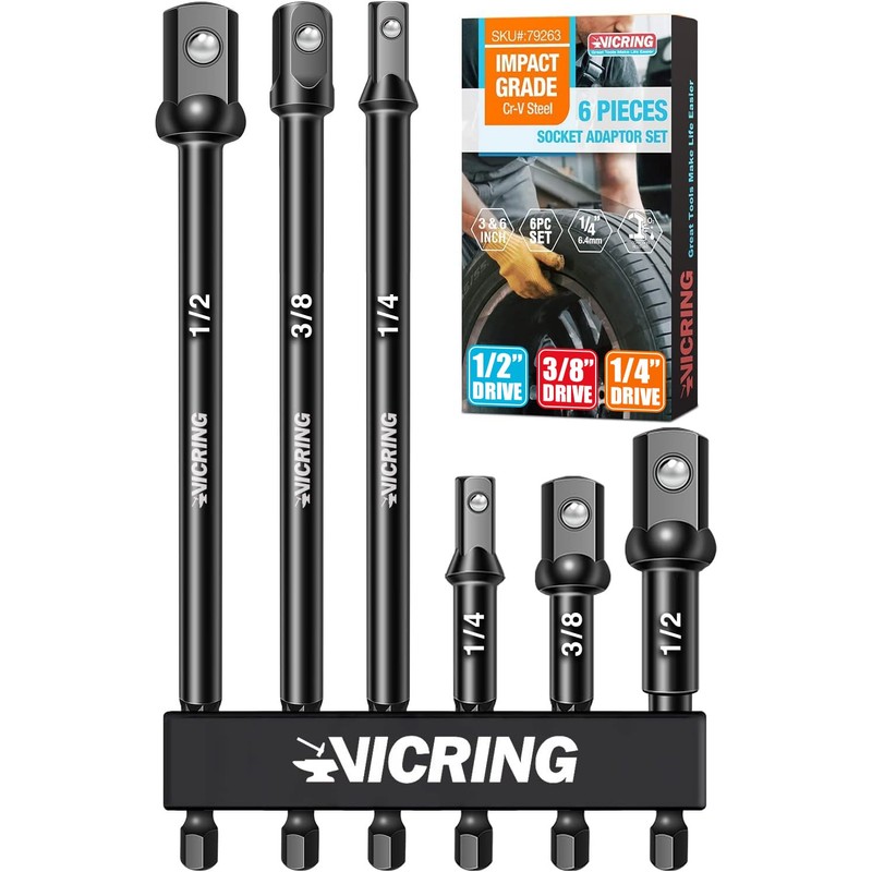- 【MAKE LIFE EASIER】VICRING dirll socket adapter set make your impact tool more useful! You can use any of sockets (1/4", 3/8", 1/2") with your impact drill, driver, screw gun and electric ratchet tool. It helps you get things done quicker and save your time.
