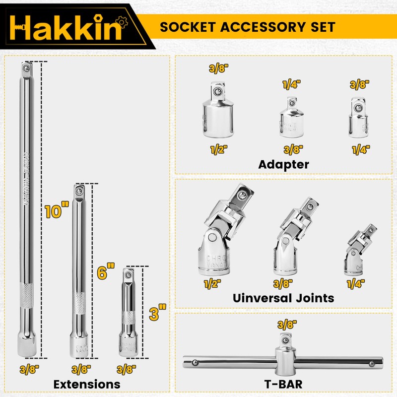 Impact Socket Accessories Set include 3Pcs 3/8" drive impact socket extension bar in 75mm, 150mm, 250mm; 3Pcs universal joints (1/2", 3/8",1/4"); 3Pcs adapter reducer (1/2" to 3/8", 3/8" to 1/4", 1/4" to 3/8"); 1Pcs T Bar.
