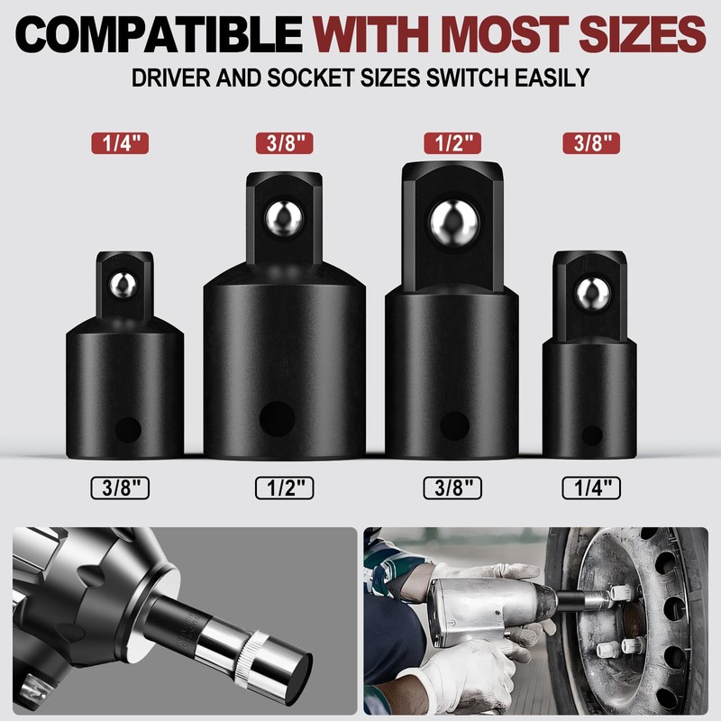 • Full-Size Compatibility – 4-Piece Universal Adapter Set: Cover all socket conversions with 1/2"-to-3/8" reducer, 3/8"-to-1/4" reducer, 3/8"-to-1/2" adapter, and 1/4"-to-3/8" adapter. Seamlessly switch between impact wrenches, ratchets, and drivers without buying multiple tools