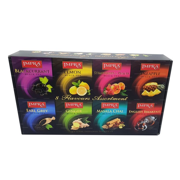 Impra Black Tea Gift Pack is a selection 8 different flavored black teas. Enjoy the following flavors of the best Ceylon teas in a variety of flavors that will excite your taste buds. Each box contains 10 individually wrapped tea bags in the following flavors; Blackcurrent, Strawberry, Pomegranate, Peach, Ginger, Cherry, Earl Grey, Mango. A great value and an opportunity to test the quality of Impra Teas.