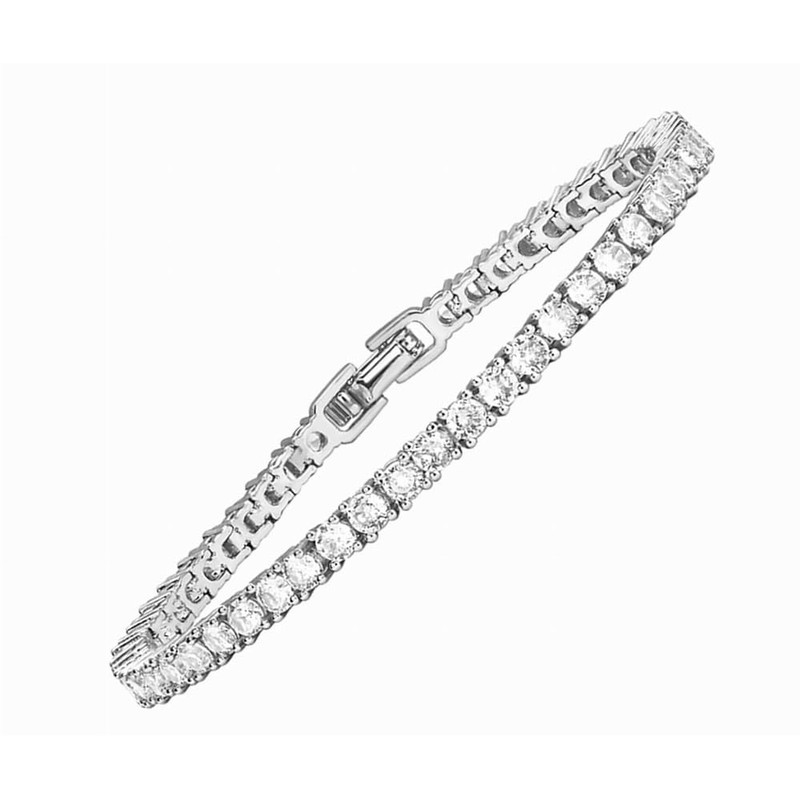 - Tennis bracelet featuring round cubic zirconia stones in four prong basket settings.