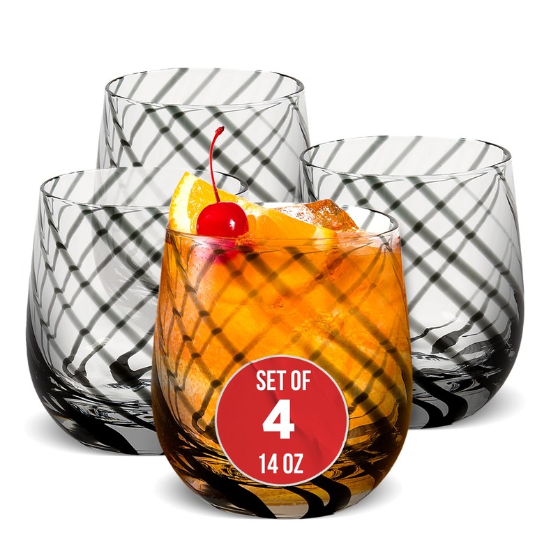 IMPULSE! Marbella Rocks Vintage Black Glassware Set of 4 - Hand-Blown Glasses with Swirl Pattern, Artisanal Craftsmanship -Transparent BPA-Free Cocktail Glasses-Comfortable Grip - 3.7 × 2.5 × 4 inches