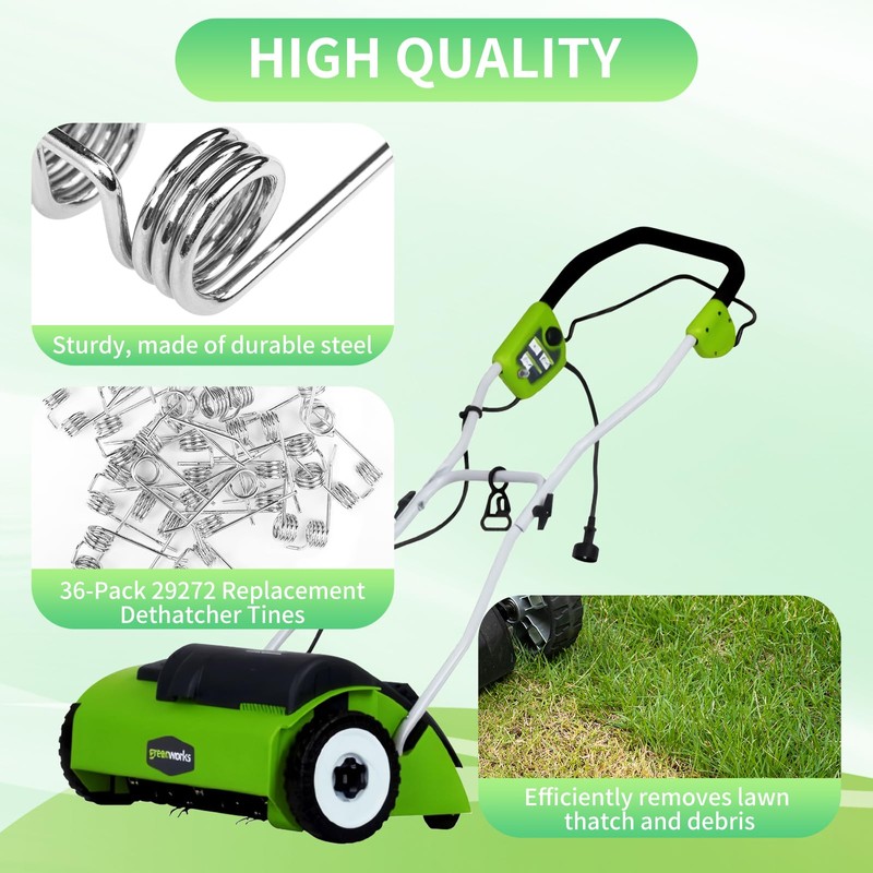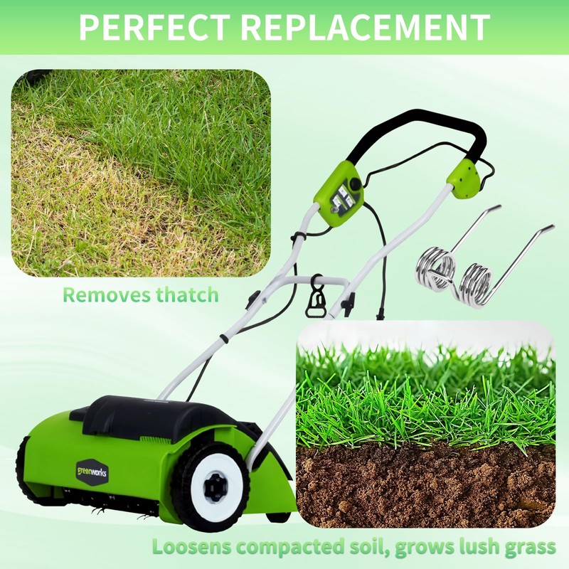 - Wide Compatibility Compatible with Greenworks 27022, 2500600G 10 Amp 14" Corded Dethatcher. This is a replacement dethatcher tines spring with part number 29272, ensuring a perfect fit for your equipment.