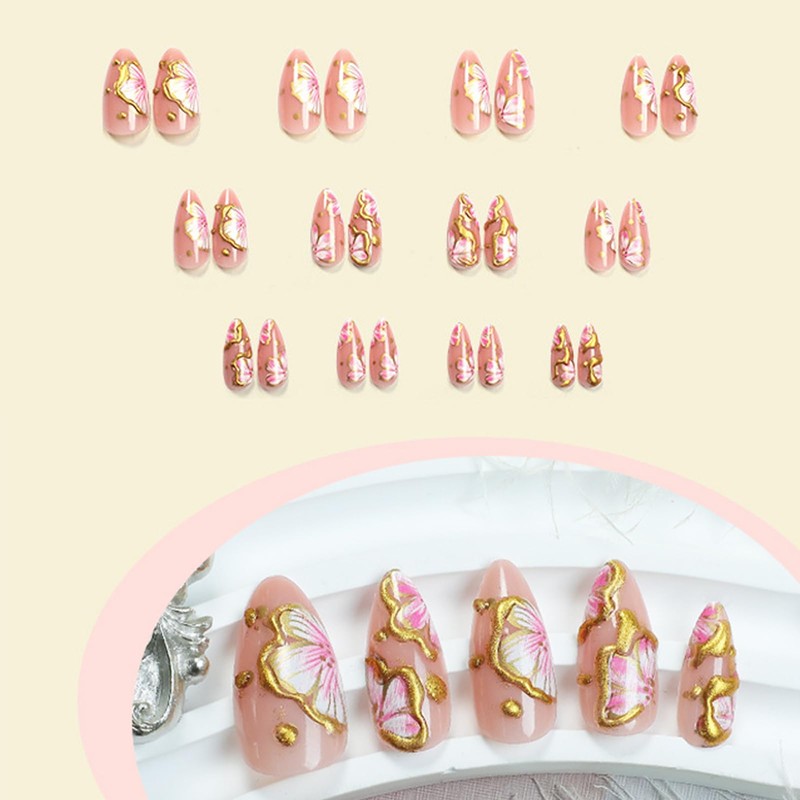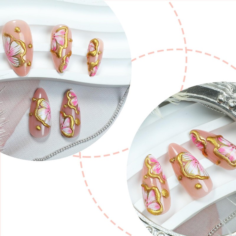 IMRAIN Medium Almond Press on Nails Nude Glossy Fake Nails with Gold 3D Pink Flower Designs Acrylic Nails Press ons Cute Glue on False Nails Reusable Stiletto Artificial Stick on Nails 24Pcs