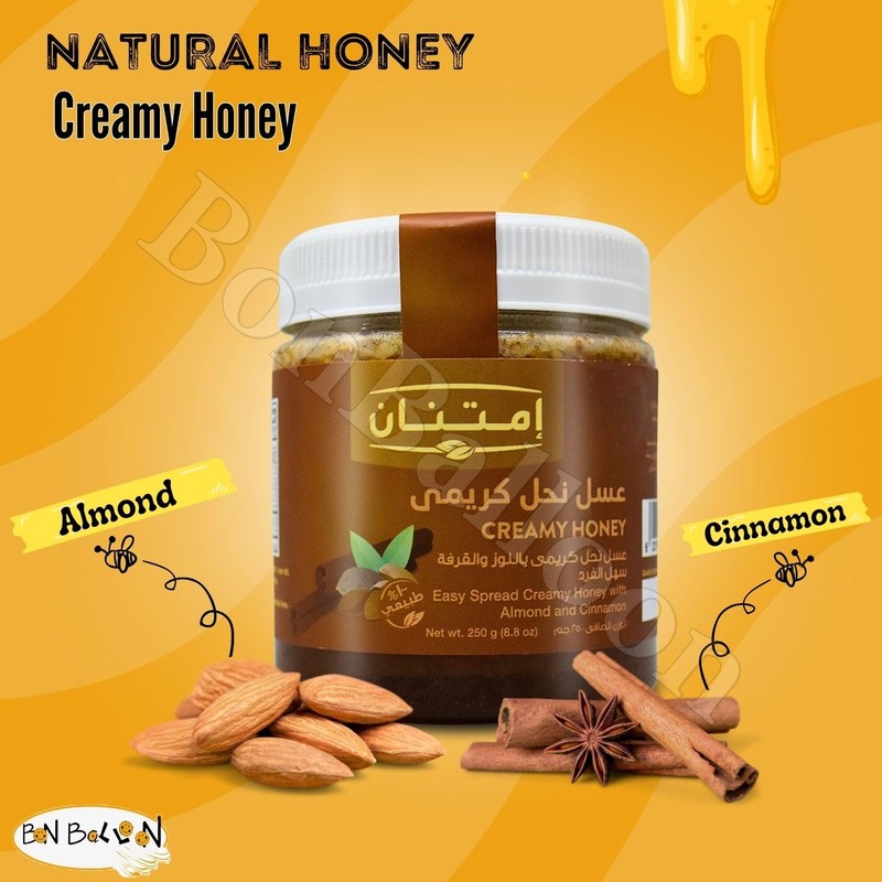 - ⏩ - Imtenan Creamy Honey With Almond And Cinnamon Easy Spread Pure Natural Egyptian Fresh Syrup Premium Egypt Brilliant Arab No Additives Kosher Halal ( 1 Pack = 8.82 oz / 250 gm ) امتنان عسل نحل كريمى باللوز والقرفة حلال