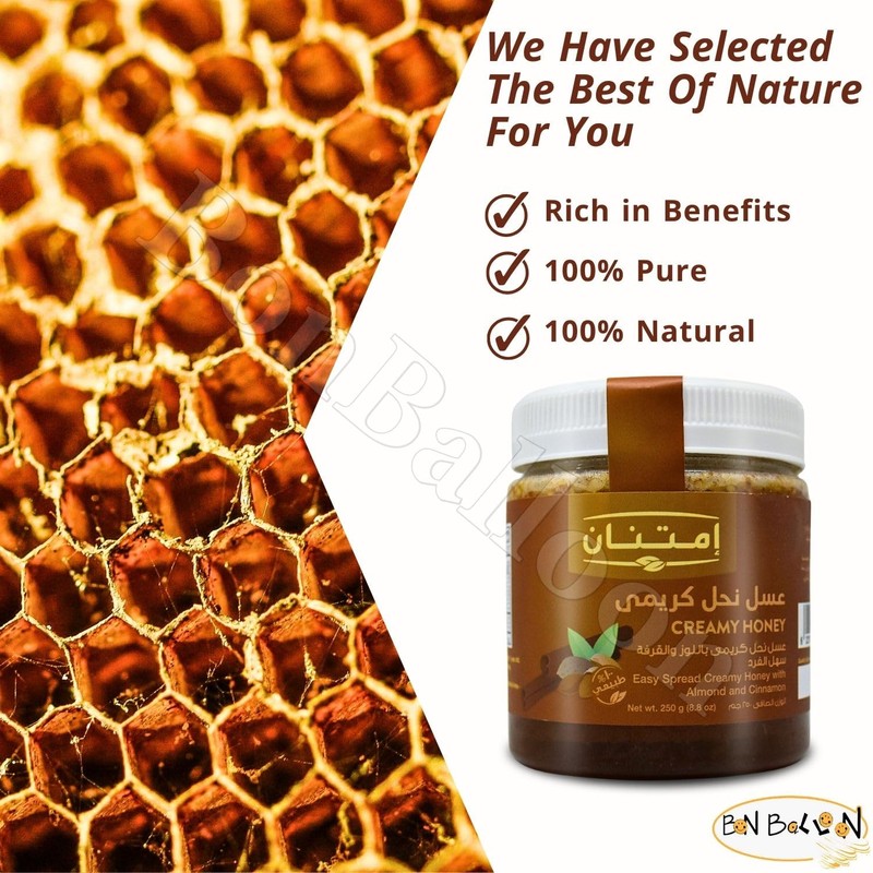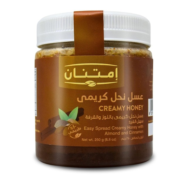 - ⏩ - Imtenan Creamy Honey With Almond And Cinnamon Easy Spread Pure Natural Egyptian Fresh Syrup Premium Egypt Brilliant Arab No Additives Kosher Halal ( 1 Pack = 8.82 oz / 250 gm ) امتنان عسل نحل كريمى باللوز والقرفة حلال