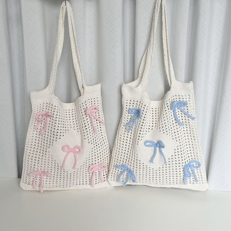 IMXPW Crochet Bow Tote Bag Beach Knitted Cute Purses Mesh Pink Aesthetic Shoulder Handbags for Women Vacation, Pink, One Size