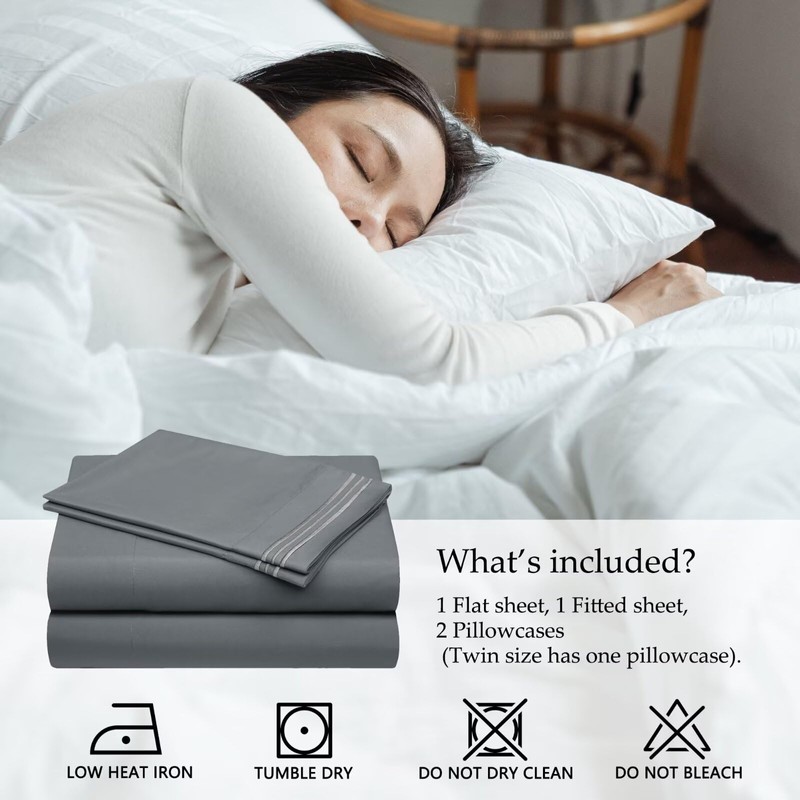 - Four pieces sets: 1 Flat sheet, 1 Fitted sheet, 2 Pillowcases (twin size has one pillowcase). Deep pocket fitted sheet with elastic all around to ensure sheets stays on bed tightly.